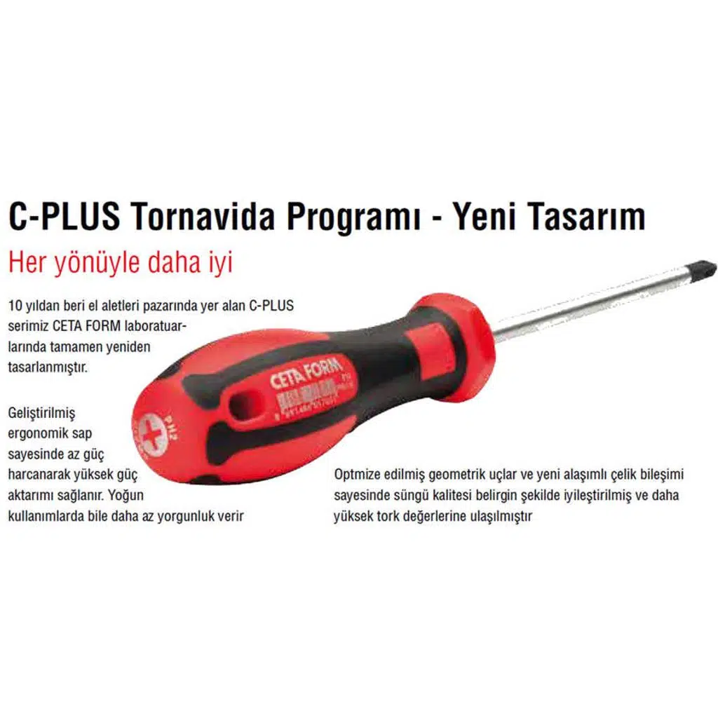 Pakette 3.0x75, 4.0x100, 5.5x125, 6.5x150, 8.0x150 mmölçülerinde 5 adet C-Plus model F10 Serisi düz tornavida bulunmaktadır.C-Plus Tornavida Özellikleri: - Geliştirilmiş ergonomik sap sayesinde az güç harcanarak yüksek güç aktarımı sağlanır. Yoğunkullanımlarda bile daha az yorgunluk verir.- Optmize edilmiş geometrik uçlar ve yeni alaşımlı çelik bileşimi sayesinde süngü kalitesi belirgin şekilde iyileştirilmiş ve dahayüksek tork değerlerine ulaşılmıştır.- Krom Vanadyum Molibden çeliği, mat krom kaplı yüzey.